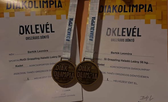 2026.04.12-én rendezték meg Budapesten a grappling diákolimpia országos döntőjét, ahol Bartók Leonóra 9/4-es tanuló Gi és NoGi kategóriában is a dobogó legfelső fokára állhatott.